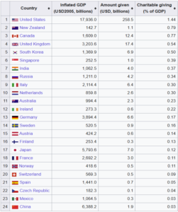 The following list of countries by charitable donation shows the total charitable donations from individuals within the nation, as a percentage of the nation’s GDP. The figures were published in February 2016 by the Charities Aid Foundation (CAF) in its report titled Gross Domestic Philanthropy.[1] The report only considers the 24 countries about which CAF was able to collect comprehensive data.
